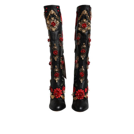 Dolce & Gabbana Black Roses Embellished Leather Heel Boots Shoes