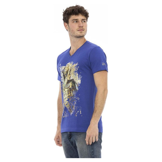 时尚蓝色 V 领 T 恤,正面印有优雅图案